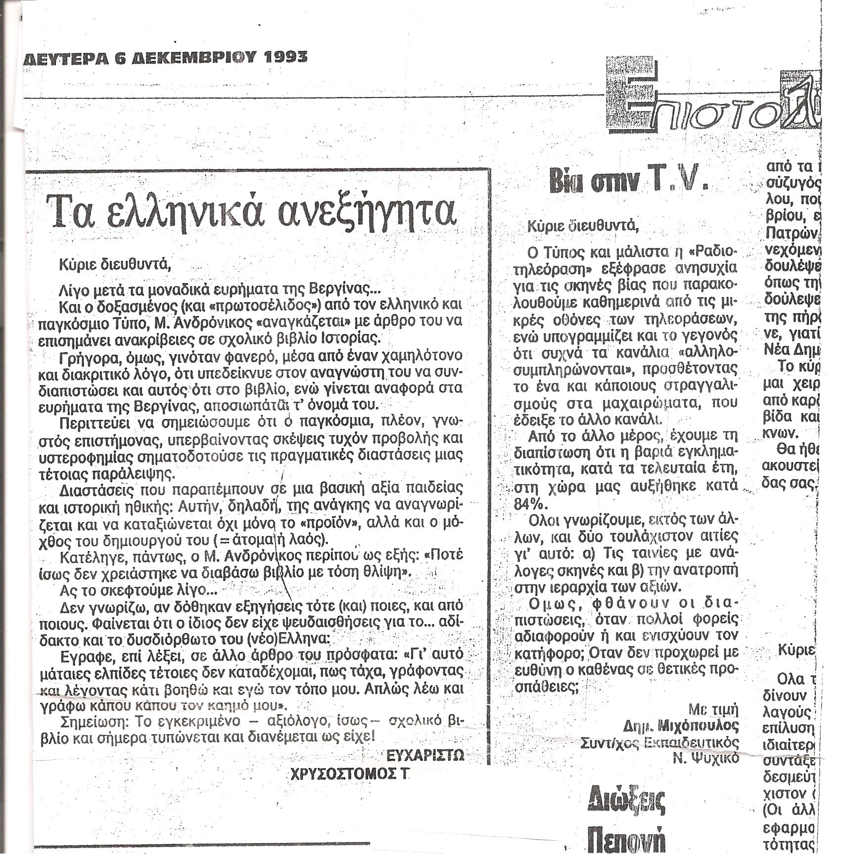 Τον Νοέμβριο του 1993 έγραψα το παραπάνω σημείωμα που λίγες μέρες μετά, δημοσιεύτηκε στον τότε «ΕΛΕΥΘΕΡΟ ΤΥΠΟ» (6 Δεκεμβρίου 1993).